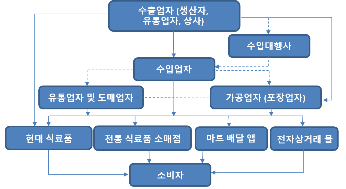 대부분의 소매 제품은 수입업체, 유통업체를 통해 수입 및 유통된다. 그러나 일부 대형 식료품 체인점은 신선식품(과일, 고기, 해산물 등)과 무알코올 음료를 직수입하기 시작했다.
